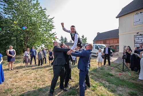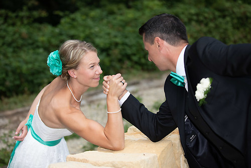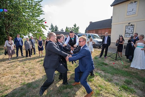 Für ein entspanntes Fotoshooting sorgen auch Bilder, die nicht ganz so ernst gemeint sind. Sicherlich kein Bild, was man sich in das Wohnzimmer hängt, aber es ist das Lieblingsbild aller Bräute. Sie hebt ihn hoch und lässt ihn am ausgestreckten Arm zappeln.